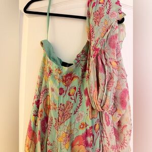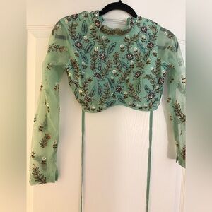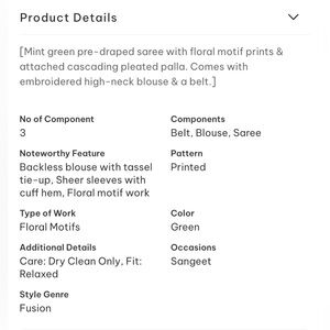 Mint green pre-draped saree with floral motif prints & attached cascading pleated palla. Comes with embroidered high-neck blouse & a belt. Bottom is pant style but draped like saree