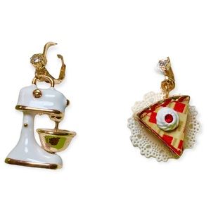 Tasty mismatched drop earrings featuring cherry pie slice and coordinating stand mixer.