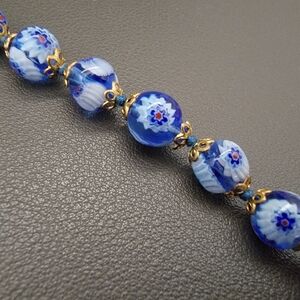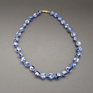 A luminous strand of cobalt blue glass beads, each one unfolding with delicate floral millefiori patterns, like painted porcelain discovered along a sunlit coast. The palette moves between deep ocean blue and soft clouded white, finished with warm gold-tone accents that lend an heirloom softness.
