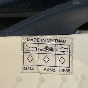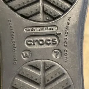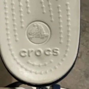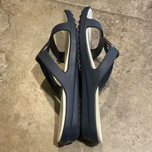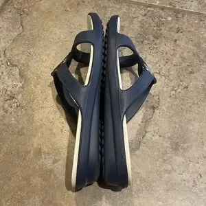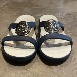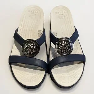 Sanrah Circle Slide Sandal, shoes in navy blue with a cream footbed and a beveled circle embellishment by Crocs in a women's size 7. Art no. 14958. Slip-on, open toes style. Constructed from Croslite material, providing lightweight cushioning and durability. Shoes are very clean and have little to no signs of use. In great pre-owned condition.