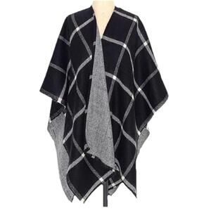 The Lauren Ralph Lauren Herringbone Windowpane Reversible Kimono Wrap is a stylish and versatile accessory for women. Made from cozy tweed fabric in black and white, the wrap features a reversible design and an open front, making it perfect for layering in the winter, fall, or spring. This designer shawl/wrap from the Lauren Ralph Lauren brand is 30 inches in length, offering a multifunctional and fashionable addition to any outfit. Gently used. No signs of wear. Smoke-free, pet-free home.