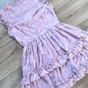 Gorgeous & girly ruffle mini dress from Lulus. Lightweight and gauzy woven jacquard fabric boast a textured, burnout floral design that shapes a crew neckline and a sleeveless, darted bodice. High-fitted waist tops a skater silhouette that ends at a tiered skirt with a flirty mini hem. Lavender in color. Ruffled trim accents the neck, bodice, and skirt. Hidden back zipper/clasp. Lined. Made of 100% polyester. Lined with polyester & spandex.