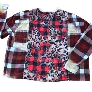 Bleached flannel reworked tee size L-XL, upcycled oversized patchwork print graphic t-shirt, pullover long-sleeved shirt. This is an interesting one-of-a-kind shirt with a patchwork print "Love" graphic on the front.