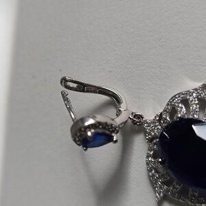 Description: This exquisite jewelry set features stunning blue lab-created sapphire stone or simulated sapphire and diamond Simulant set in elegant Sterling Silver. One of the earring backs has to be tightened. Perfect for adding a touch of sophistication to any outfit.