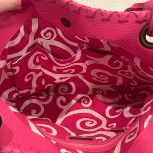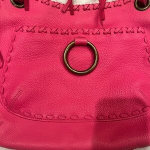 Bold pink hobo bag by Isabella Fiore. Features braided handles and tassel accents. Perfect for a stylish look. Minor marking on the back. Measures 11x15x2.5