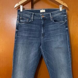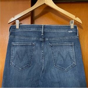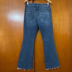 MOTHER The Weekender Fray Flared Jeans in Groovin” Wash. You can see minor stretch lines in the denim at the thigh when folded; not noticeable when wearing because it’s stretch denim.