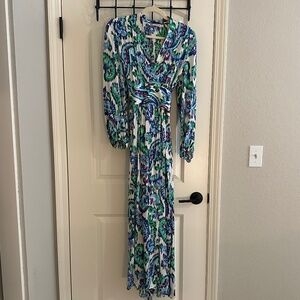 Front pareo style closure with self ties wrap style midi dress, V-Neck front. Long sleeves with elastic cuffs, front pareo style closure with self ties