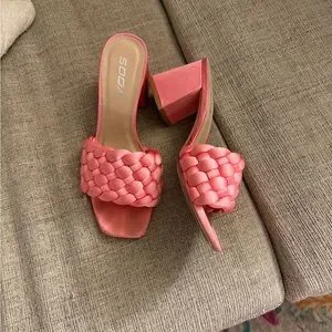 Elegant coral braided mules by Soda. Stylish and comfortable for any event.