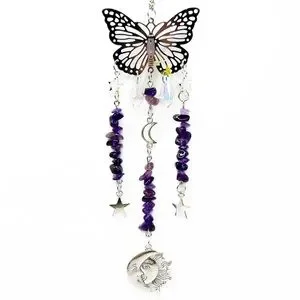 Elegant butterfly suncatcher featuring amethyst gemstones and silver accents. Perfect for adding a touch of whimsy to any room!