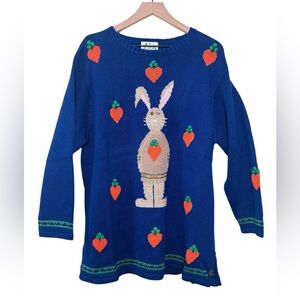 Vintage Y2K Quacker Factory novelty knit sweater featuring a whimsical bunny and carrot motif on both the front and back. Rich cobalt blue knit with dimensional carrot details, embroidered accents, and classic late-90s/early-2000s Quacker Factory charm. Relaxed, tunic-style silhouette with decorative hem and cuff detailing.
