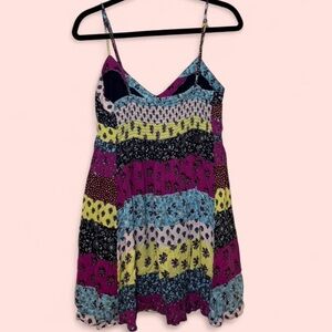 Navy dress with floral trim. Features a mix of blue and pink flowers.