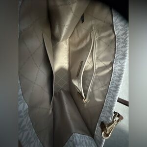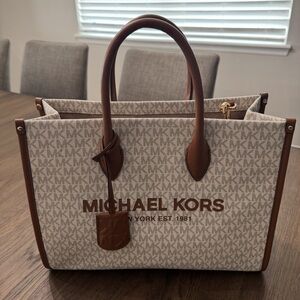 Stylish Michael Kors tote for women. Features a tan and brown design. Perfect for everyday use. Perfect quality and condition. Feel free to offer. Never really used, selling because i am moving!! Comes with strap as well! Measurements shown in pictures!