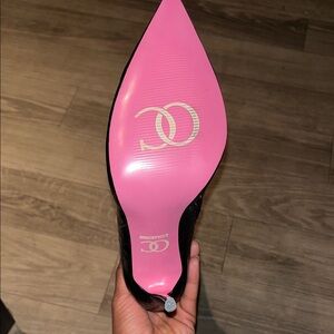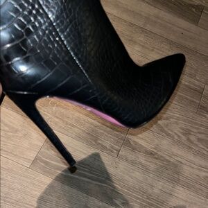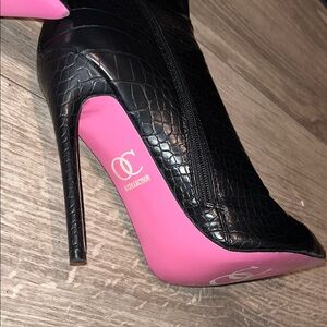 Elevate your style with these chic black stiletto knee-high boots. Perfect for any occasion, these boots feature a sleek design and a striking pink sole for a pop of color.