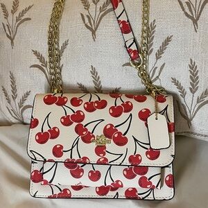 Coach limited edition Cherries bag. Bag is stunning with its double gold chain! Bag is perfect on outside. There is one spot in the corner on the inside that has minor peeling. Vibrant red cherry design. Gold chain strap adds elegance.