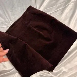 I wore this once and it’s so flattering! The color is a dark burgundy, although it appears brown in the pics..The material is similar to velvet. There’s a zipper on the side and the belt is removable. Runs very slightly large.