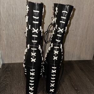 you've got me in stitches! These ankle boots have a vegan leather construction, front lace up closures with D-ring hardware, contrast white stitching details all over, and platform soles