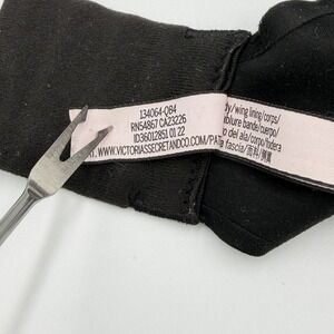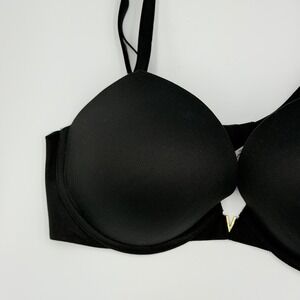 Victoria's Secret push-up bra in classic black, size 38D / D85. Features smooth molded cups with underwire support for lift and shaping. Adjustable shoulder straps and hook-and-eye back closure. Clean minimalist design with a subtle gold-tone VS center accent.