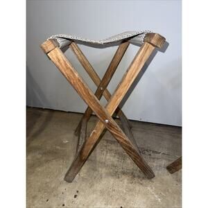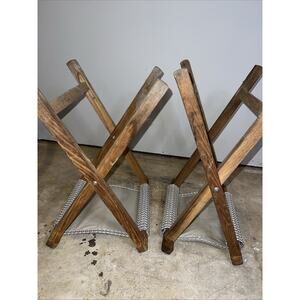 This product is a set of two vintage canvas folding camp stools designed for camping and fishing. The stools are portable and have a tabletop made of durable canvas material, with a frame constructed of wood. Perfect for sitting around a flaming fireside while enjoying nature, these stools are ideal for outdoor recreational activities. The sturdy construction and portable design make them convenient and comfortable seating options for any outdoor adventure.