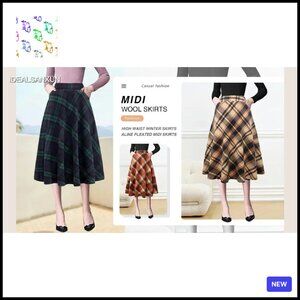 Woolen Plaid A-Line Midi Skirt High Waisted Pleated Classic Fall Winter Chic
