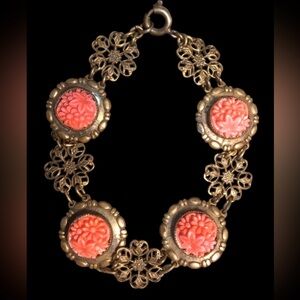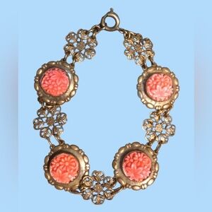 This exquisite bracelet features intricate gold floral designs paired with stunning pink accents. Perfect for adding a touch of elegance to any outfit.