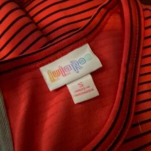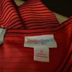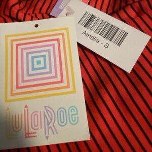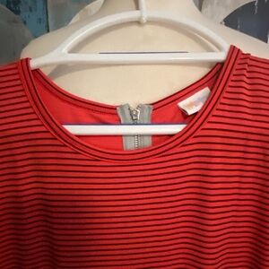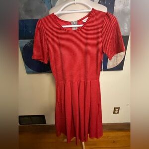 Ladies size small. Red with black stripes. large back zipper detail. Front has pleated skirt. Two side seam pockets.