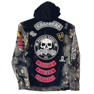 Reason NYC Distressed Bleach Splatter Hooded Denim Jacket Patches Mens XL Black