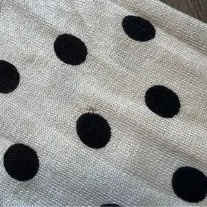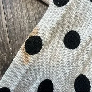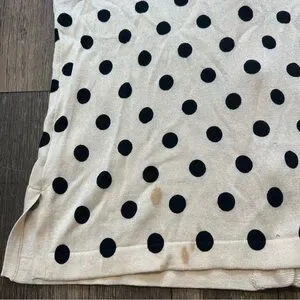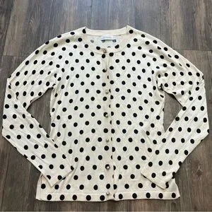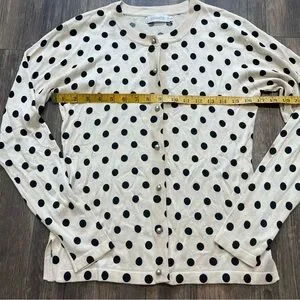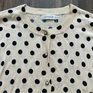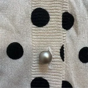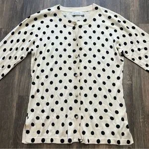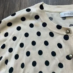 Stylish and very soft lightweight Vintage Entracte Silk Cashmere polka dot cardigan sweater. Features black dots on a cream background and gorgeous pearl like gray buttons. Perfect for casual or formal wear.