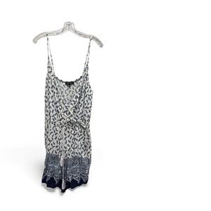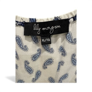 This stylish Lily Morgan romper features a soft lightweight fabric with a blue and white paisley print, wrap front, and adjustable drawstring waist. Perfect for summer days or layered with a cardigan for casual outings. Excellent pre-owned condition.