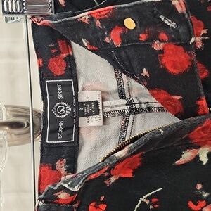 Elegant pants with a striking red floral design on black. Ideal for making a statement. light stretch.