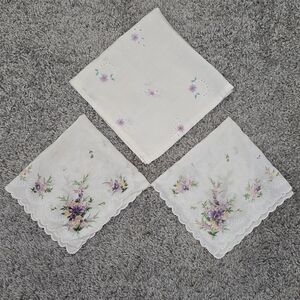 This vintage bundle of 3 handkerchiefs includes a set of 3 white handkerchiefs featuring beautiful floral designs in shades of purple, pink, and yellow with vibrant green leaves.