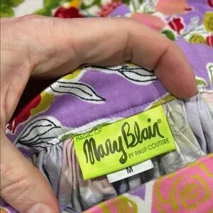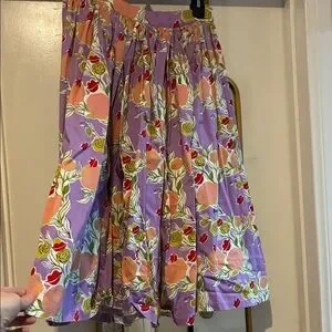 Charming A-line skirt with a purple base. Features vibrant floral patterns in red, yellow, and orange. Ideal for a lively wardrobe addition.
