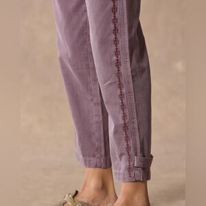 Our easy-fit, utility camp pants are so comfortable and flattering, with a Hollywood waistband, floral and geometric embroidery, metal rivet detail at front pocket and adjustable leg opening