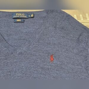 Great condition. Size large. Vneck style. Lightweight sweater. Longsleeve. Wool blend. Ribbed design on hem, cuffs and neckline. Darker red logo on upper left chest. Measurements and fabric content listed above in pictures.