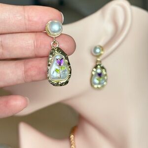 Charming earrings with a gold frame. Features a pearl stud and rose detail. Adds elegance to any look.