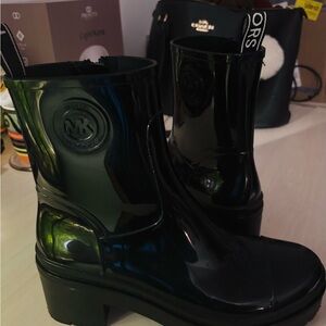 Glossy black rain boots by Michael Kors. Stylish and waterproof. Ideal for wet weather.