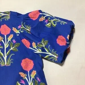 Chic floral blouse with vibrant blue and pink hues. Features elegant puff sleeves and a stylish neckline. Perfect for adding flair to any outfit.