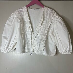 Excellent condition bundle of three size medium Zara tops. Includes soft green collared sweater, white button front cotton eyelet blouse with puff sleeves and Ivory metallic stripe blouse with ruffled collar and cuffs.