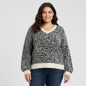 This item is a LOFT Leopard Print V-neck Soft Fuzzy Sweater. It features a black and white leopard or cheetah animal print with a cream-colored trim along the v-neckline, hem, and cuffs.