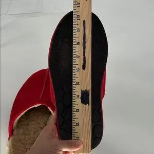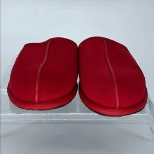 Soft red suede slippers with plush interior. Ideal for warmth and comfort.