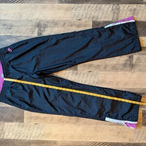 These are Nike track pants in black with pink and white trim. They are in excellent pre-owned condition. They are a size medium, and the last two images show measurements. Pull-on style with internal drawcord and elastic waistband. Black polyester shell, white mesh polyester lining, zippers at the hems.