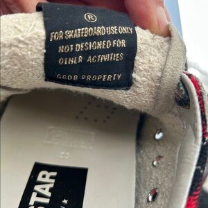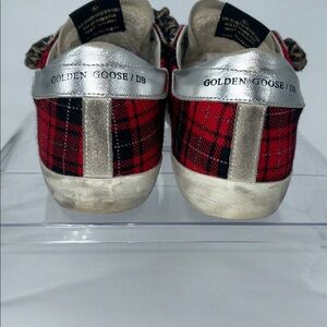 Stylish GGDB sneakers with leopard print laces and red accents. Perfect for a bold look.