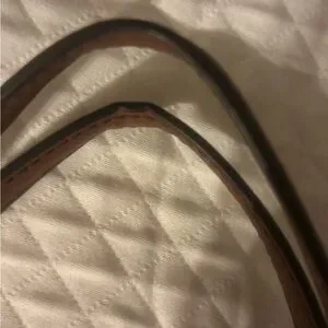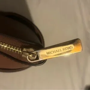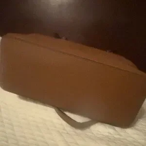 Stylish Michael Kors tote in a warm tan shade. Features sleek design and iconic logo charm. Perfect for everyday elegance. Please see photos 15 and 16, the hook I had it hanging on in my closet left a slight crimp in the straps, hopefully they’ll straighten back out.