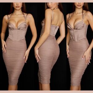 NEW $269 House Of Cb [ XS ] JOSEPHINE Taupe Pleated Corset Midi Dress T2013