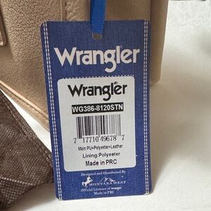 Elegant Wrangler satchel with a brown and cream pattern. Features stylish fringe details and sturdy handles.
