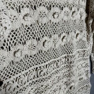 This rare Express Tricot handknitted sweater tunic captures all the dreamy 90s boho energy. Made from ramie-cotton blend, it features intricate open-knit crochet work with floral and scalloped detailing throughout.