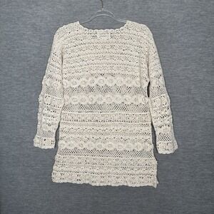 Express Tricot Handknitted Crochet Sweater Tunic – XS – 90s Vintage Boho Cream Open Knit