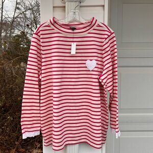 NWT Talbots Fun Pink Cream Stripe Appliqué Eyelet Heart Ruffled Cuff Top. 1X Bust 47”, 2X Bust 51”, Length 27”. Originally $89.50. Enjoy!