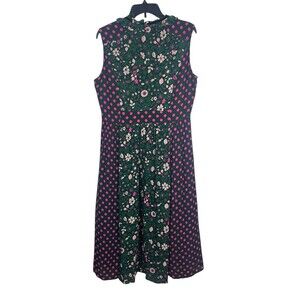 Boden Green Floral Pink Polka Dot Midi Dress Sleeveless Tie Neck US 10R Cottage