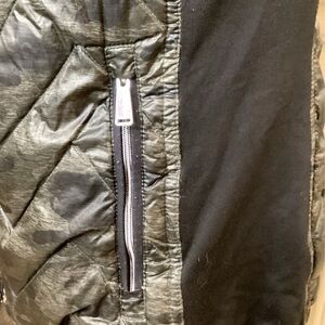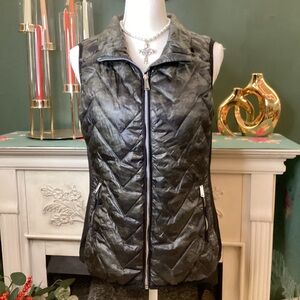 Sleek metallic black vest with quilted design. Features a full zip front. Ideal for layering.