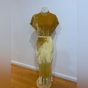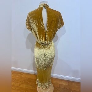 Gold velvet (58% Rayon, 42% Silk). Maxi dress. Cap sleeves. Mock neckline. Bodice lined. Open back with hook and eye. Concealed center back zip fastening. See fit notes for more information. Imported